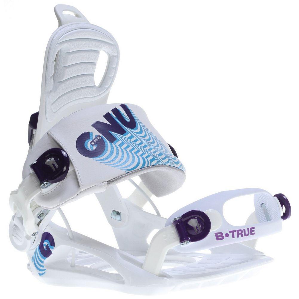 Stop borrowing your boyfriend's big and bulky bindings and pick up a pair of GNU B-True Snowboard Bindings. They're designed specifically for women with an easy rear-entry system that makes getting out on the hill faster and easier. The thin fit toe strap is light and fits over the shape of women's boots for a tried and true fit while cam lever buckles offer quick and easy tool-less adjustments for on hill tweaking. B true to yourself with the GNU B-True Snowboard Bindings.