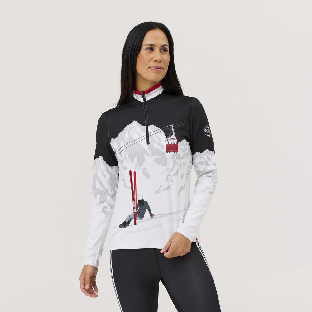 Inspired by the lift line and built for the slopes, the Gondola Top blends vintage-inspired artwork with high-performance stretch. Breathable, quick-drying, and full of color, it’s a top you’ll wear from chairlift to cheers. Engineered for movement and built with purpose, this stretchy fabric blends recycled polyester with spandex for soft compression, quick-drying comfort, and four-way flexibility. Moisture-wicking and UPF 50+ rated, it’s ready for everything from snow days to après.