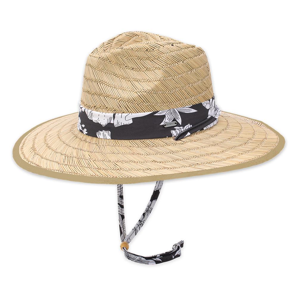 Inspired by the classic straw lifeguard hat, the Del Mar is a handmade, full-brim style with a structured weave that really holds its shape. Tropical print fabric on the band and cord add some balmy flair to this women's sun hat. Inside, a soft, stretchy band gives you a comfortably snug and non-scratchy feel.