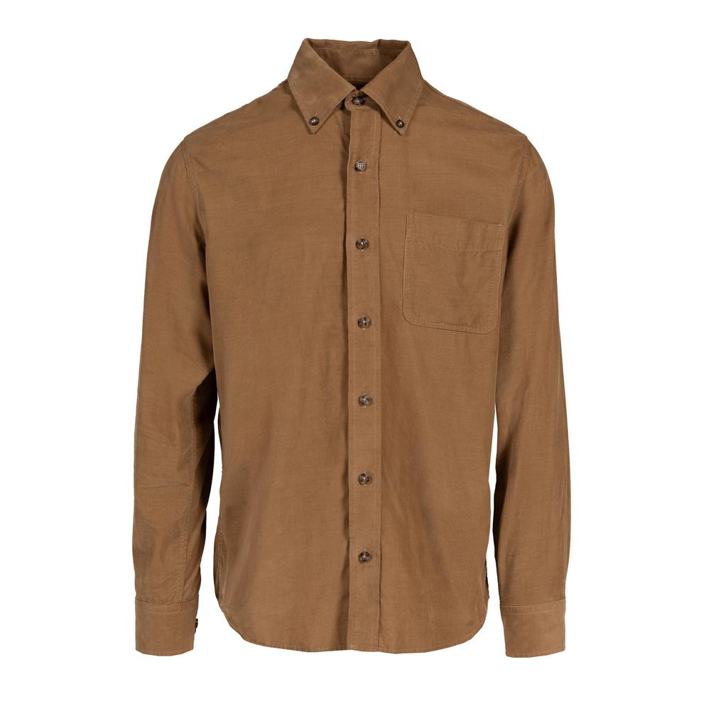 Long sleeve light weight cotton pinwale corduroy shirt features horn button down collar and front closure, upper chest sewn on pocket and set on cuffs with button closure details.